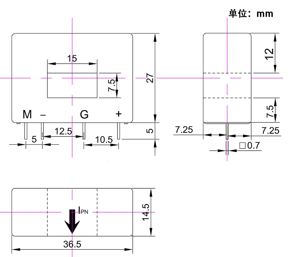| IP | 原边电流测量范围 | 0~±40 | 0~±75 | 0~±150 | A |
